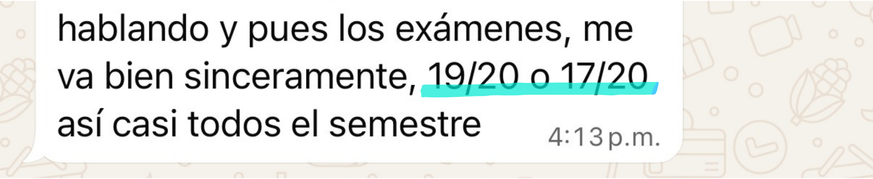 Como Laura Valencia de la UAS... que al final de su primer semestre nos dijo que había sacado puras buenas calificaciones... y por cómo lo dijo creo que ni siquiera lo pensaba tanto...
