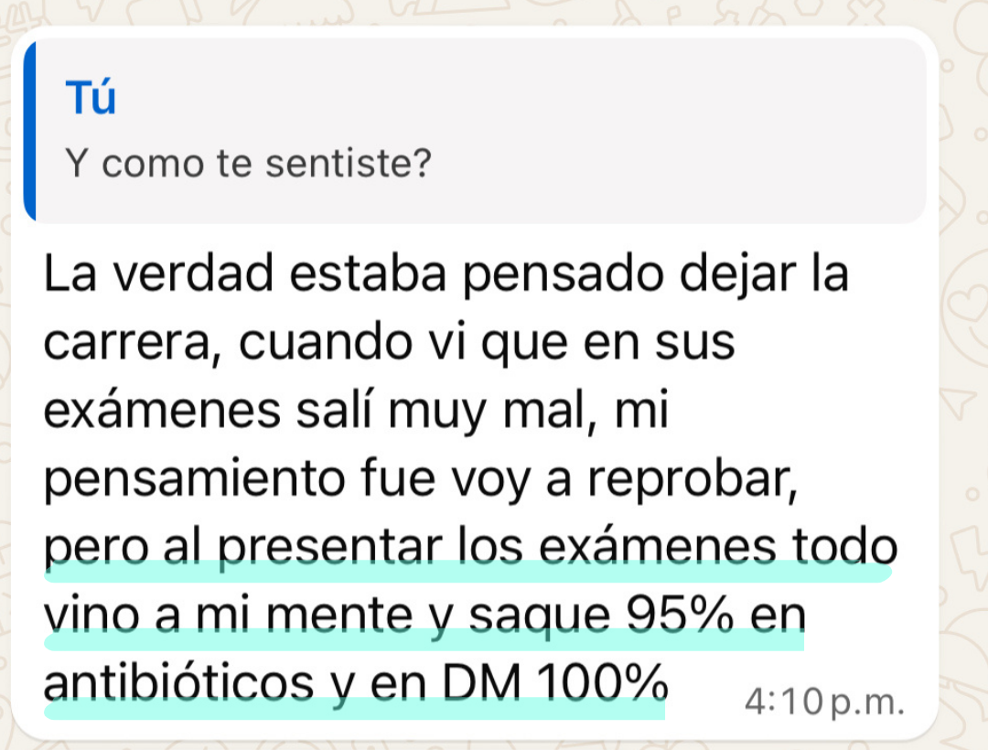 Como Alejandra Castillo de la UNAM... que reprobó farma y estaba pensando en dejar la carrera... pero sacó 95 en su examen de antibióticos... y 100 en el de diabetes...